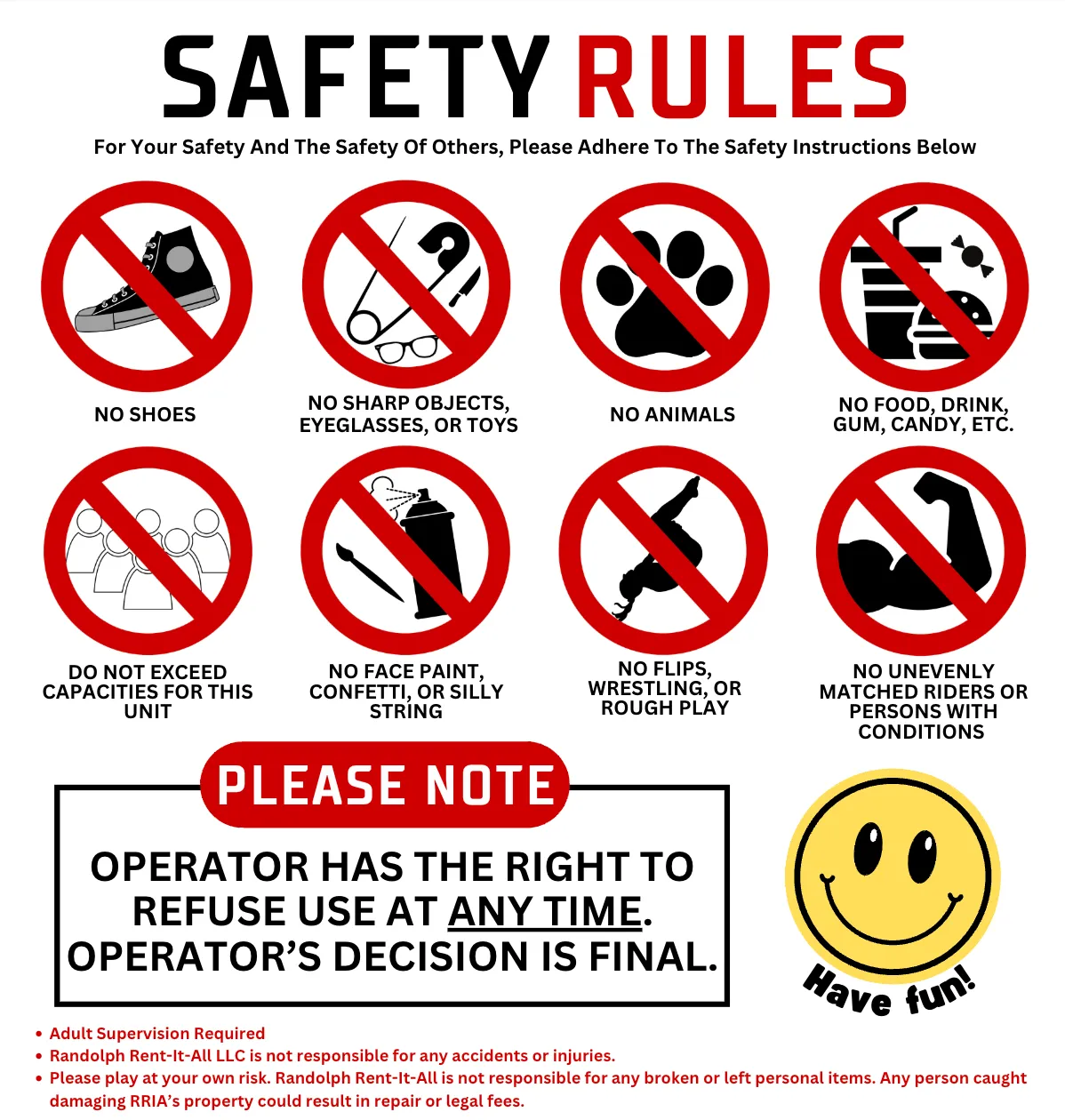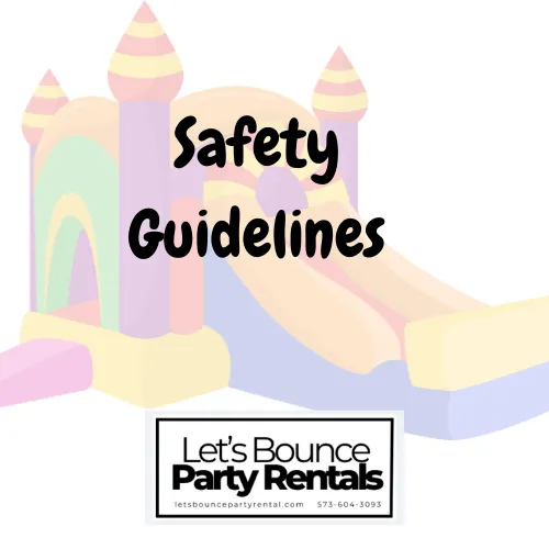 Safety guidelines very depending on the unit type. Let's Bounce Party Rentals will inform you upon booking of unit-specific guidelines/rules.